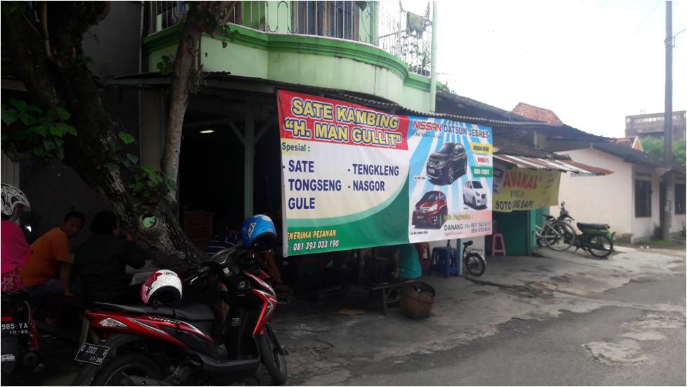 Setelah diberitakan oleh seorang teman bahwa Sate Man Gullit saat ini tengah populer dan terkenal empuk daging sate kambingnya, rasanya perlu bertandang ke sana. Pagi itu saya ke sana. Benar juga warung sate pinggir jalan itu sudah begitu ramai pembeli. Samping warung telah penuh dengan motor-motor berjajar parkir. Mobil pembeli di parkir di sisi pinggir seberang jalan.